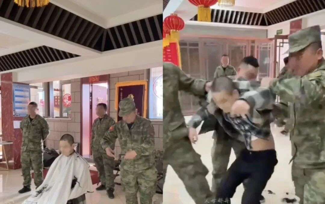 教官又把手机拿到刘成面前,一个人正用推子把刘成的头发全部剃掉,另一个人则在旁边看守。不到一分钟,刘成就成了寸头。教官依旧很生气,走到镜头前又骂了两句,“还你妈肖像权,谁你妈告诉你的?找死。”然后宣布,刘成这一周都睡走廊。