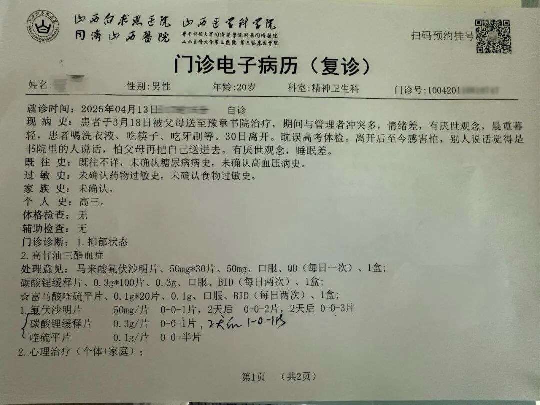 离开特训营两周后,山西白求恩医院给刘成出具的病历/受访者供图