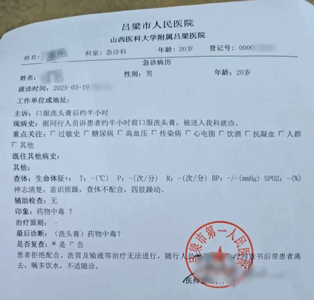 刘成在特训营内试图喝洗发水自杀,医院出具的病历写道,“患者拒绝配合,洗胃及输液等治疗无法进行,随行人员签署拒绝治疗同意书后带患者离去”/受访者供图