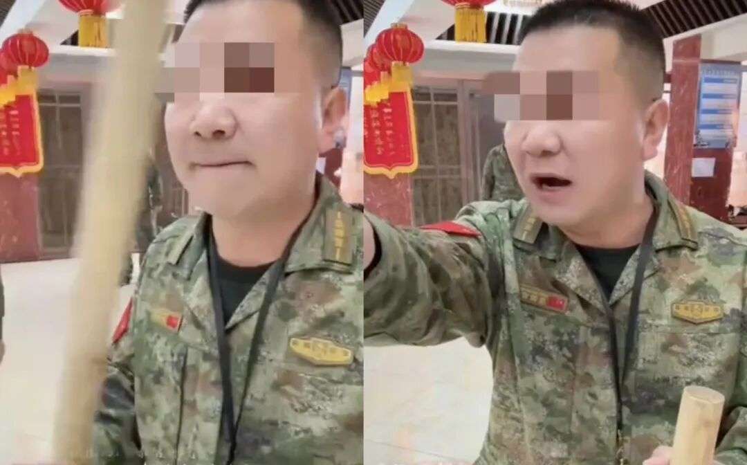 刘成被架走后,直播的教官挥舞手中的木棍,嘴里念叨着“找死”