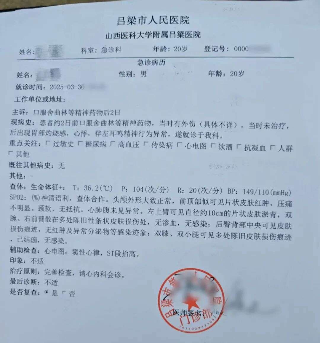 刘成离开“三和尖兵特训营”当日,吕梁市人民医院出具的急诊病历/受访者供图