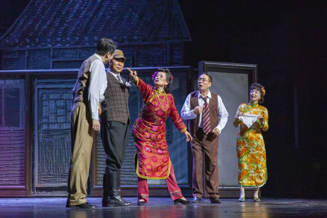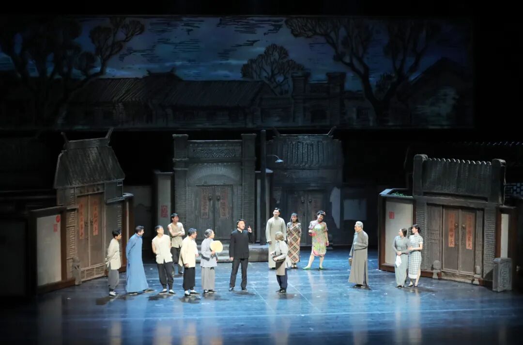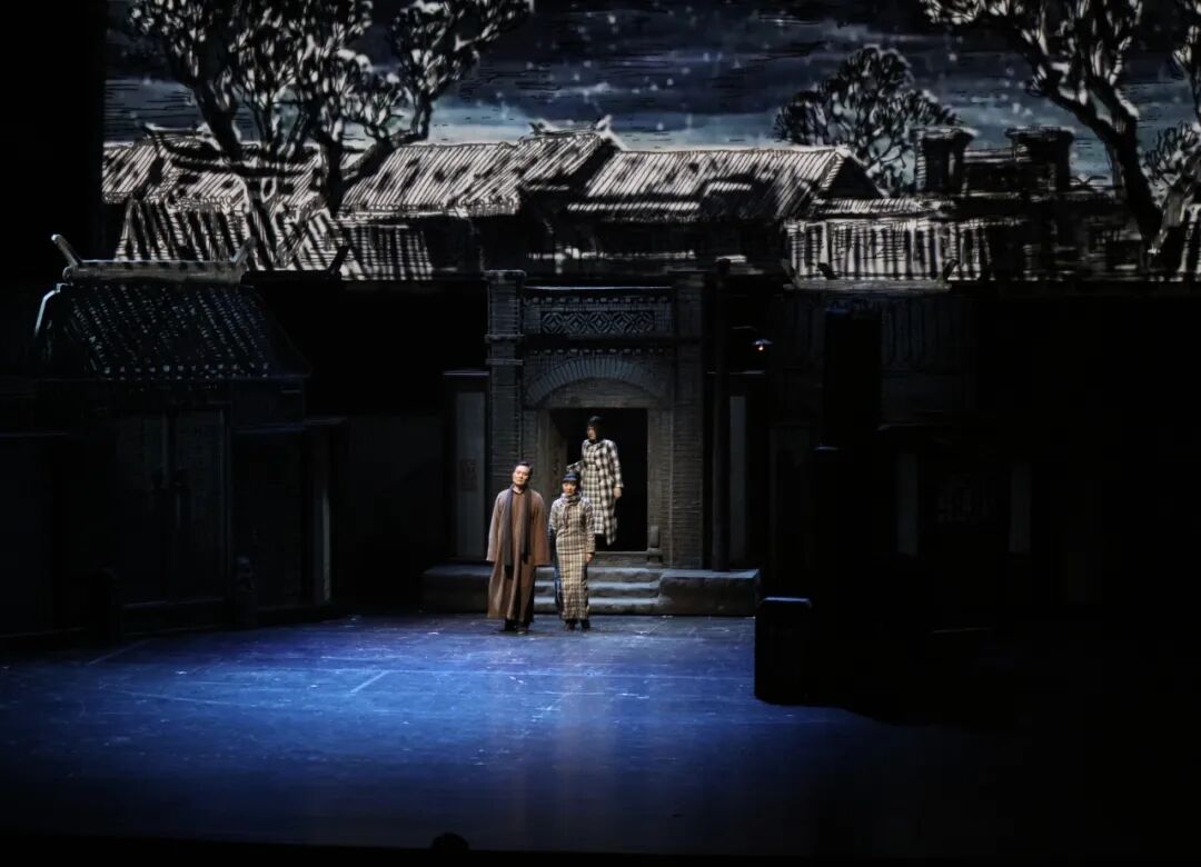 舞美设计将“小羊圈胡同”的布景设置为可以打通的一个个房间宅院,解决了室内室外关系。这一设计不仅让场景切换流畅如电影镜头,更通过旋转的视角,呈现出“同院不同天”的戏剧张力。