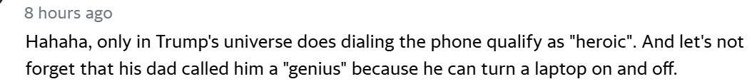 “笑死我了,只有在特朗普宇宙里,打个电话都算得上是英雄壮举。别忘了,他老爸还夸他是个天才,只因为他会给笔记本电脑开关机。”