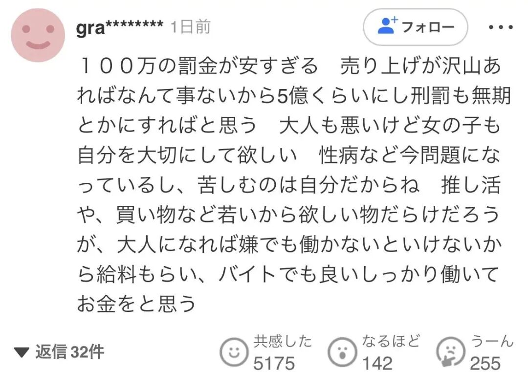 100万日元的罚金太少了,如果靠这赚了很多钱,这点钱根本不算什么。所以我觉得应该罚5亿,甚至判无期徒刑。虽然这案件的成年人很坏,但我希望那些女孩也能珍爱自己。毕竟性病等问题现在很严重,受苦的还是自己。我知道追星、购物等,年轻时想要的东西很多。但等你长大了,即便不喜欢也需要工作。所以,不管是打工还是什么,希望你们都能踏踏实实地工作赚钱。