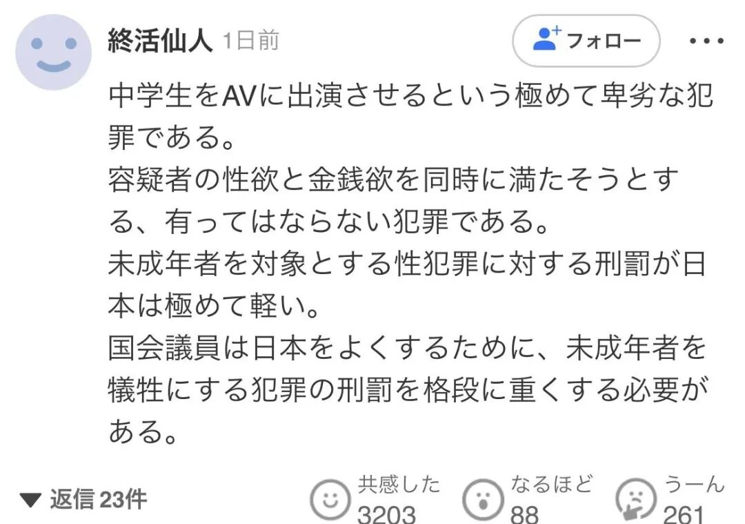 诱使中学生出演成人电影,真是一种极其卑劣的犯罪行为。这是为了同时满足嫌疑人的性欲和金钱欲,是一种绝不该存在的犯罪。日本对于以未成年人为对象的性犯罪的刑罚,极其之轻。为了国家的未来,国会议员们有必要加重这种牺牲未成年人利益的犯罪的刑罚。