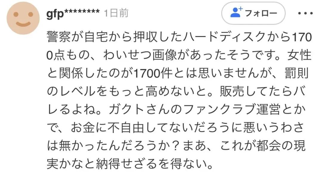 听说警察从他家里查扣的硬盘中发现了多达1700件色情影像。我可不相信他只和女性发生了1700次关系。如果不把惩罚的力度再提高,是不行的。如果是进行贩卖的话,肯定会暴露的吧。听说还经营GACKT粉丝俱乐部等业务,应该不缺钱才对,难道之前就没有什么不好的风评么?唉,也许这就是大城市的现实吧,让人不得不接受的现实。