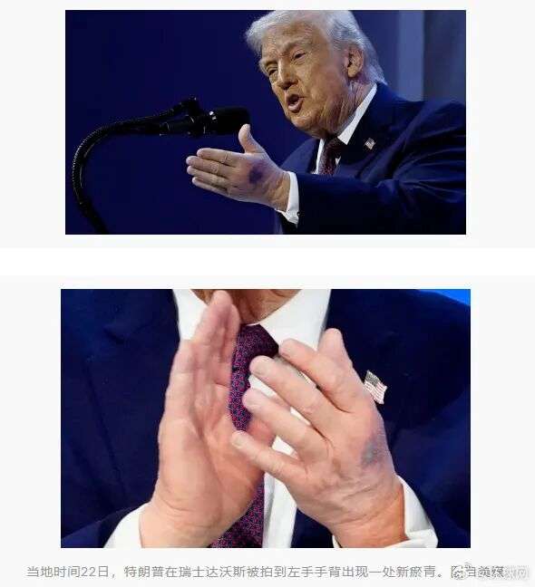 1月23日,@环球网:据外媒报道,美国总统特朗普当地时间22日在瑞士达沃斯参加美国主导的所谓加沙“和平委员会”签约仪式时,被拍到左手手背出现一处新瘀青,与他之前右手手背的瘀青类似。