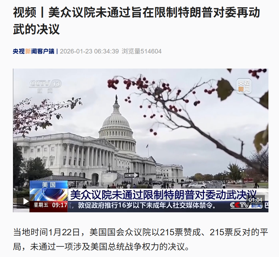 据央视新闻报道,当地时间1月22日,美国国会众议院以215票赞成、215票反对的平局,未通过一项涉及美国总统战争权力的决议。