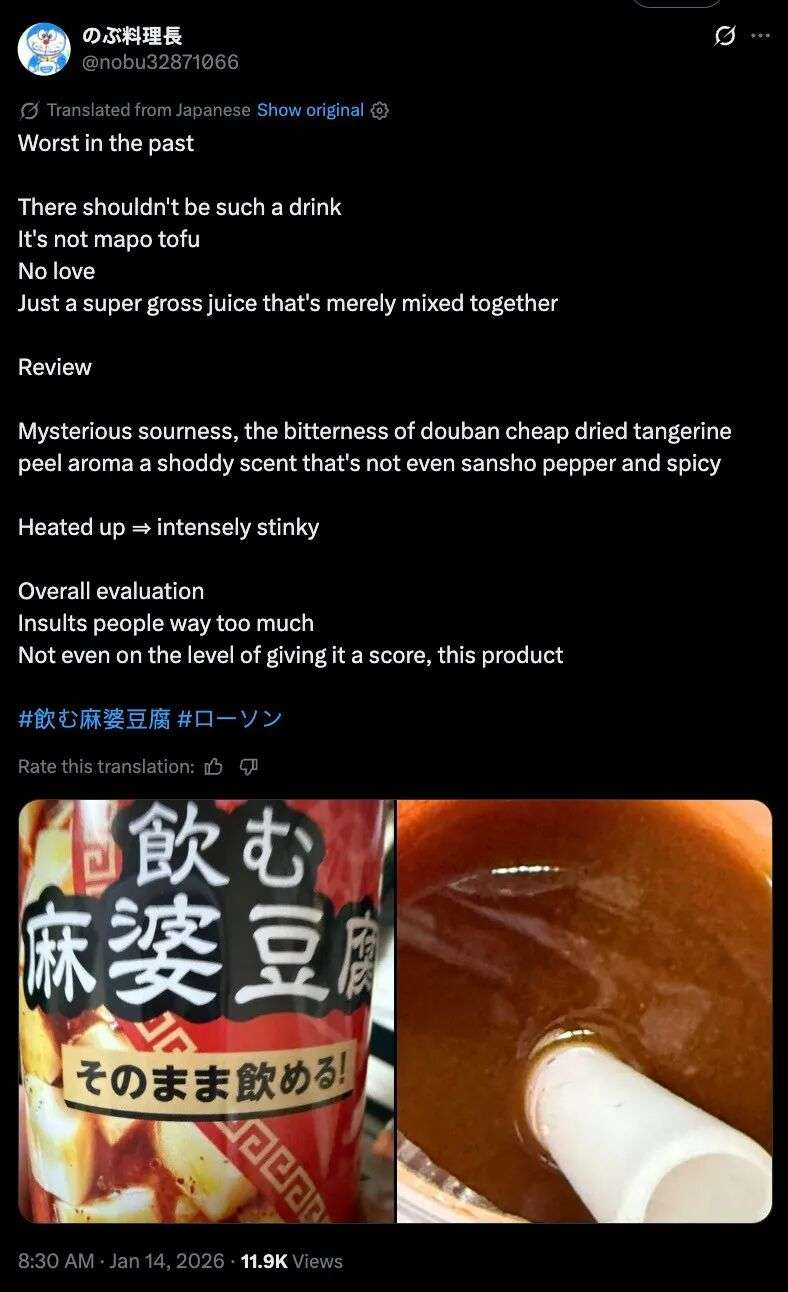 日本人之所抢空了“喝的麻婆豆腐”,就是为了“试毒”或发帖吐槽,所以销量才逆势走高。