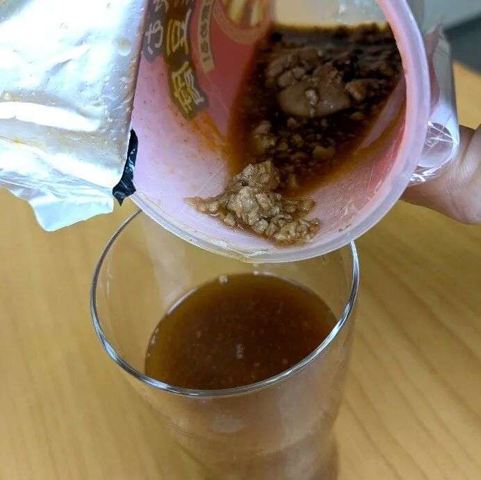 把汤汁倒进玻璃杯后,杯底的块状沉淀物浮现了出来,含有豆腐和肉沫,说是麻婆豆腐好像也名副其实。