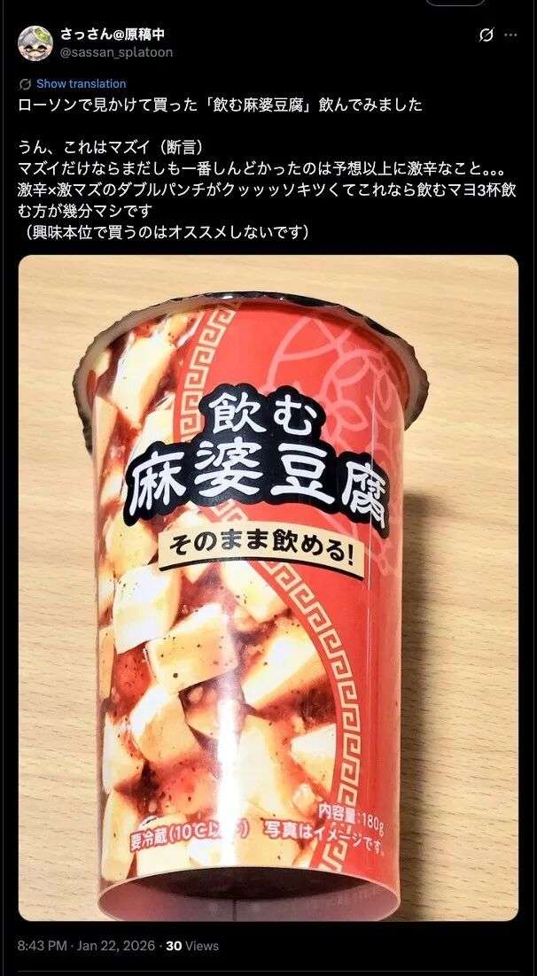 罗森便利店在本月13日面在全日本的分店上架了“喝的麻婆豆腐”(飲む麻婆豆腐)。