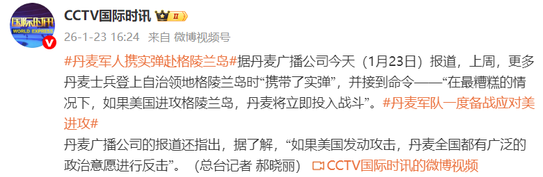 据CCTV国际时讯援引丹麦广播公司今天(1月23日)报道,上周,更多丹麦士兵登上自治领地格陵兰岛时“携带了实弹”,并接到命令——“在最糟糕的情况下,如果美国进攻格陵兰岛,丹麦将立即投入战斗”。