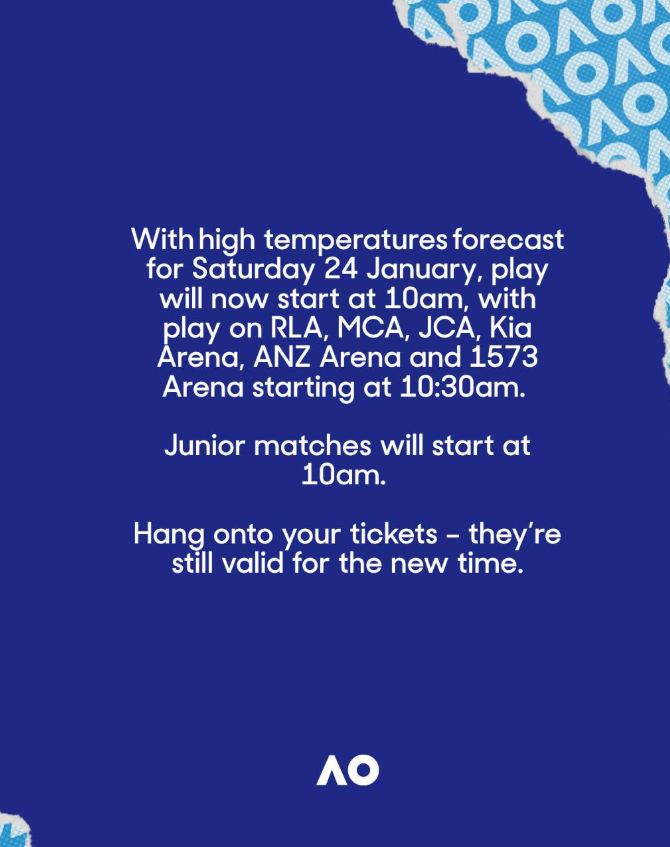 澳网官方社媒刚刚已经宣布:天气酷热、改变日程、部分比赛提前开始!