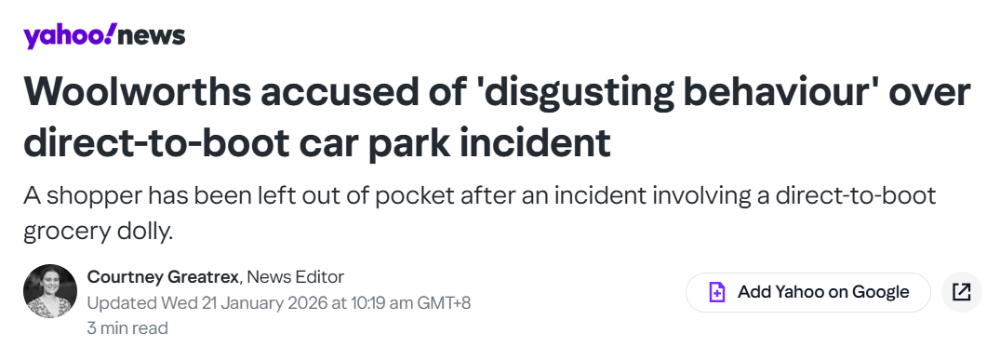 最近,墨尔本Ferntree Gully的一位顾客Jasmin就遇上了这样一件“又气又冤”的事,让她忍不住怒斥Woolworths的行为“太恶心”。