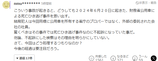 “一看到这样的事故,不由得让人想起2024年6月20日发生的财政省公用车造成的致人死亡逃逸事件。