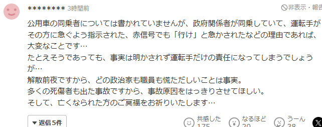 也有日本网友认为司机闯红灯,是不是因为解散前夜车上的相关工作人员催促导致的。
