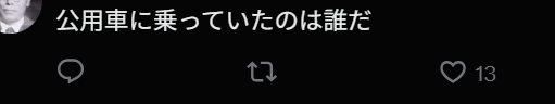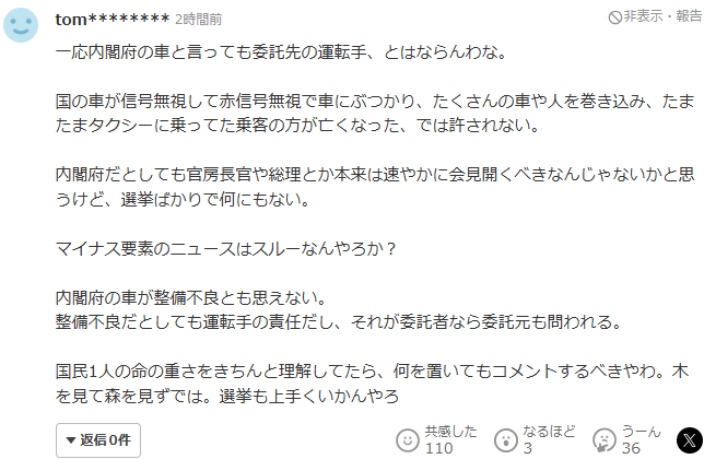 即便是内阁府的车,我觉得官房长官或者首相本来就应该迅速召开记者会,但现在只顾选举,什么都没有。负面新闻就这样被忽视吗?我觉得内阁府的车不太可能是因为保养不良出事的。即便是保养不良,那也是司机的责任,如果是委托的司机,那么委托方也要承担责任。如果真正理解一个国民的生命的分量,那么无论如何都应该做出评论。只看到树木却看不到森林,这样选举也不会顺利的吧。”