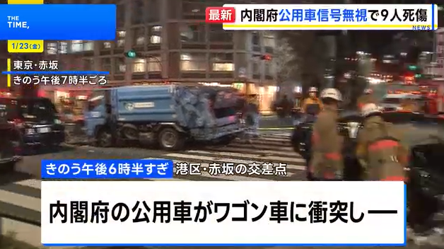 1月22日傍晚,东京港区赤坂特许厅前的交叉路口发生一起严重的多车交通事故。