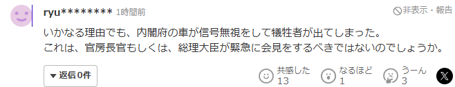 “无论出于何种理由,内阁府的车辆闯红灯,导致有人伤亡。