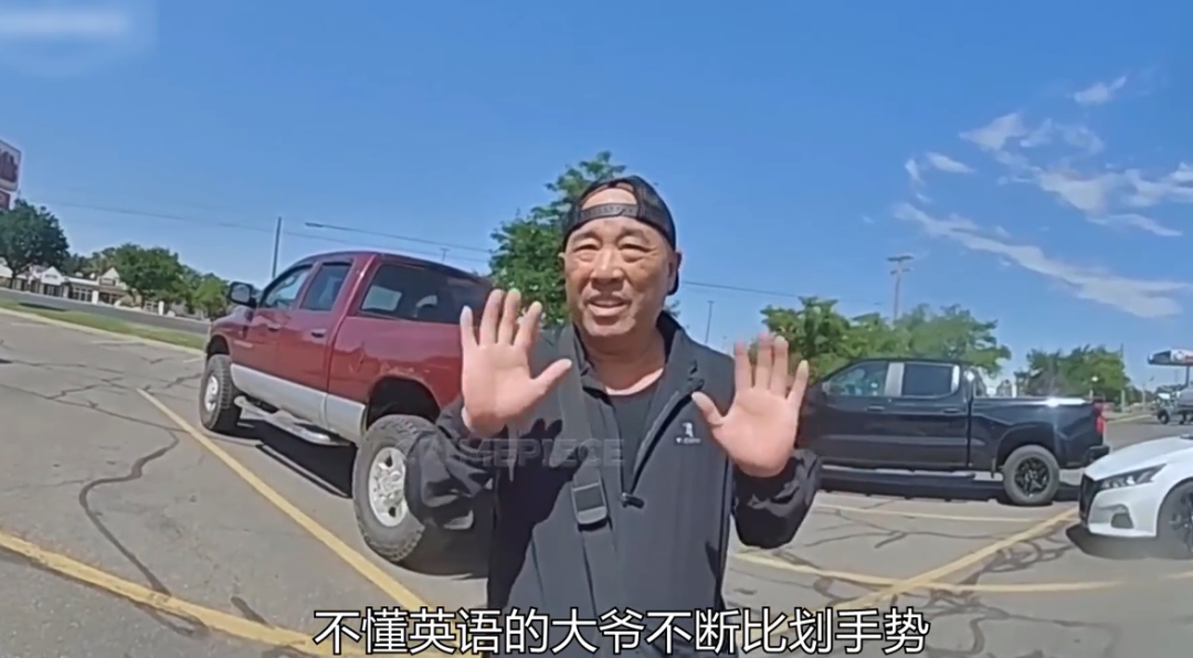 警察开始询问,大爷不懂英语,只能不停比划手势,还把包翻开给警察看,想证明自己“没问题”。