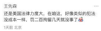 甚至有人把矛头指向更大的社会情绪:“还是美国法律力度大,在咱这,好像类似的犯法没成本一样,罚二百拘留几天就没事了”