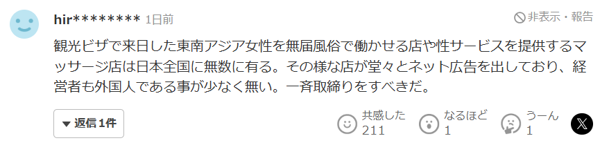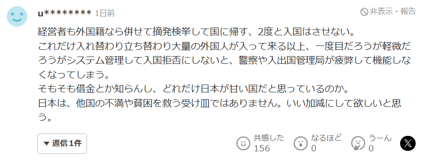 如果经营者也是外国籍,就应当一并查处、逮捕并遣返回国,今后永久禁止其入境。在如此频繁、持续有大量外国人出入境的情况下,不管是初犯还是轻微违法,如果不进行系统化管理并列入拒绝入境名单,警方和出入国管理局迟早会不堪重负、无法正常运作。至于什么负债之类的理由,我不关心。到底把日本当成了一个多么宽松、好欺负的国家?日本并不是用来承接其他国家不满情绪和贫困问题的避风港。真的希望适可而止。