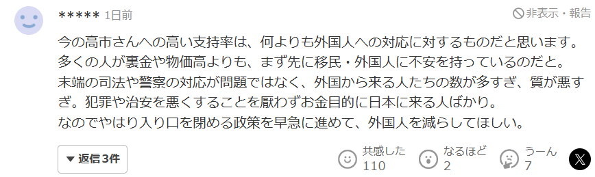 现在对高市的高支持率,我认为最主要原因正是她在应对外国人问题上的立场。相比“政治献金黑金”或物价上涨,很多人首先感到不安的,其实是移民和外国人问题。问题不在于基层司法或警察的应对方式,而在于来自国外的人数实在太多、整体素质太差。许多来日本的人只为赚钱,甚至不惜犯罪、破坏治安。因此,还是应该尽快推进“关闭入口”的政策,减少外国人数量。