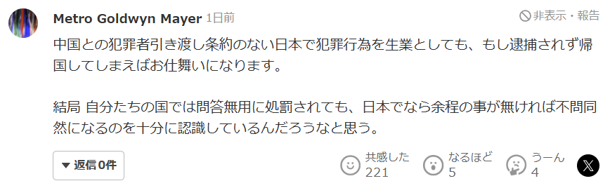 在与中国之间没有犯罪引渡条约的日本,即便把犯罪行为当作谋生手段,只要没有被逮捕、直接回国,一切也就结束了。说到底,他们大概非常清楚,在日本,只要不是特别严重的情况,几乎等同于不被追究。