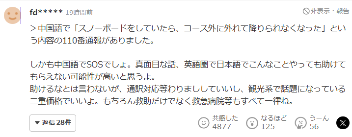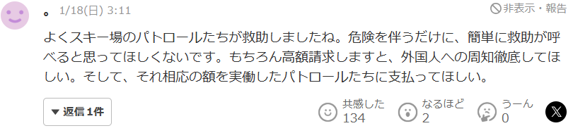 “真亏是滑雪场的巡逻人员进行了救助。救援本身伴随着危险,希望不要让人产生“可以轻易呼叫救助”的想法。当然,也希望能向外国人充分告知将会收取高额费用,并且将相应的费用支付给实际参与救援行动的巡逻人员。”