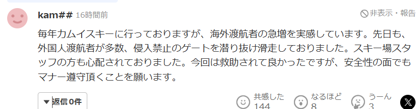 “我每年都会去神居滑雪场,近几年明显感受到海外游客数量大幅增加。前不久还看到有不少外国游客穿过明确标示为禁止进入的闸门,在管制区域外滑行,连滑雪场的工作人员都对此表示担忧。