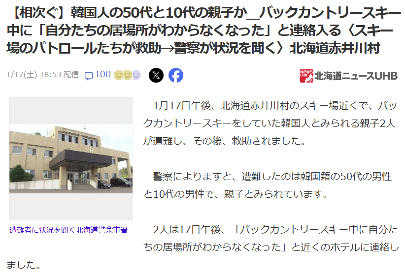 两天后的17日,北海道赤井川村一处滑雪场附近,再次发生外国游客遭难事件。一对来自韩国的父子在进行雪场外滑雪时迷失方向,无法确认自身位置,只得先联系附近酒店求助。