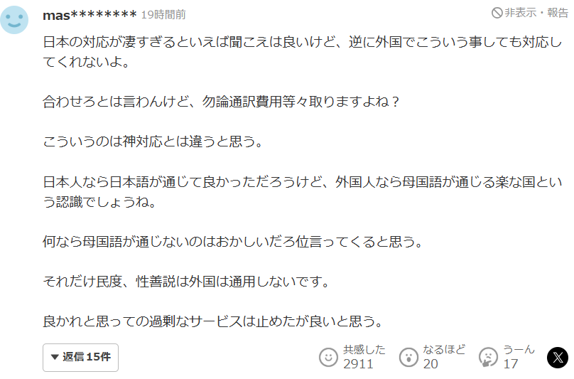 如果是日本人,至少语言能够直接沟通,确实会觉得幸好能用日语说明情况;但对于外国人来说,反而可能会形成一种认知——这是一个连母语都能被照顾到、非常省事的国家。甚至不排除有人会认为母语无法沟通才是不正常的。