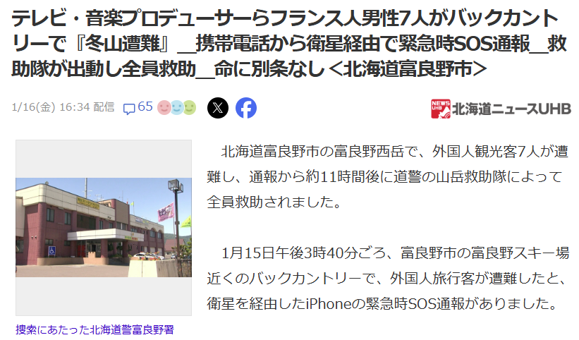 1月15日,富良野市富良野西岳附近,7名法国籍男性在滑雪时险些遇难。他们所使用的滑行装备中,用于上坡防滑的防滑皮发生破损,导致行动能力受限,最终无法按计划返回。