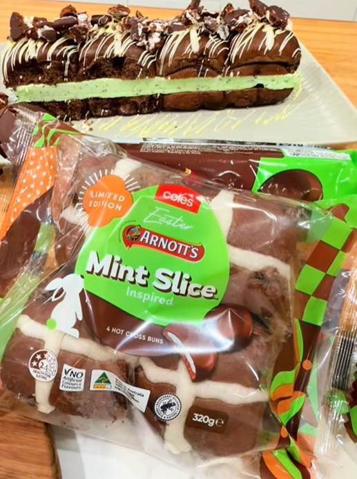 Arnott’s 薄荷巧克力十字面包:用的是浓郁巧克力面团,里面塞满巧克力块和薄荷味软糖颗粒,相当于把经典的Mint Slice饼干“翻译”成了面包。