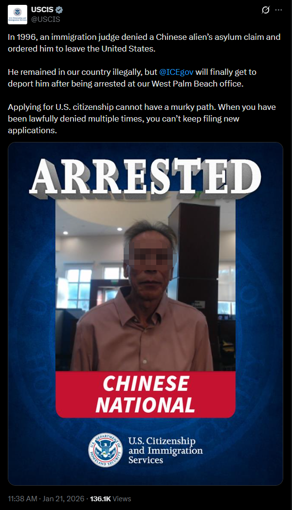 美国公民及移民服务局(USCIS)近日在社交平台X上发布一则执法通报,披露一名中国籍男子因长期非法滞留美国,在佛罗里达州西棕榈滩(West Palm Beach)移民办公室被逮捕,目前将由移民与海关执法局(ICE)执行遣返程序。