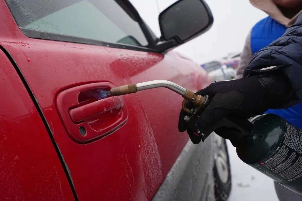 1月24日,美国得克萨斯州阿灵顿,市民试图用火解冻被冰冻的车门。