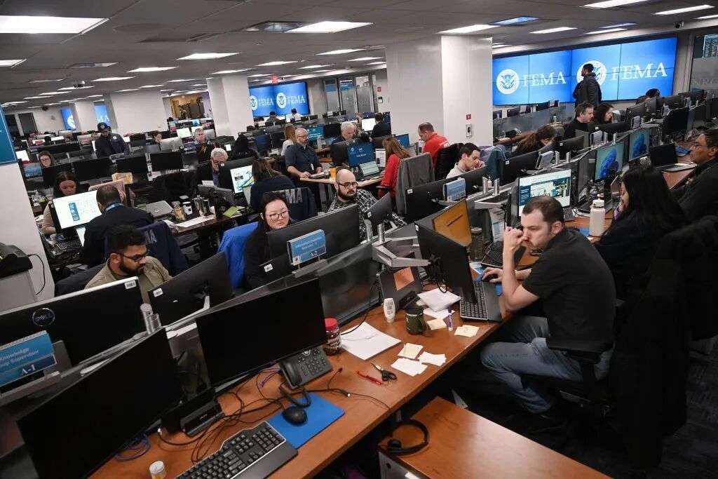 1月24日,美国华盛顿,联邦应急管理局(FEMA)总部的国家响应协调中心,工作人员正在监测一场影响美国大部分地区的冬季风暴。