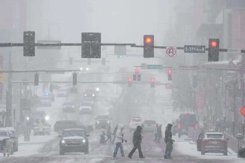 1月24日,美国田纳西州纳什维尔,冬季风暴中,行人穿过百老汇大街。