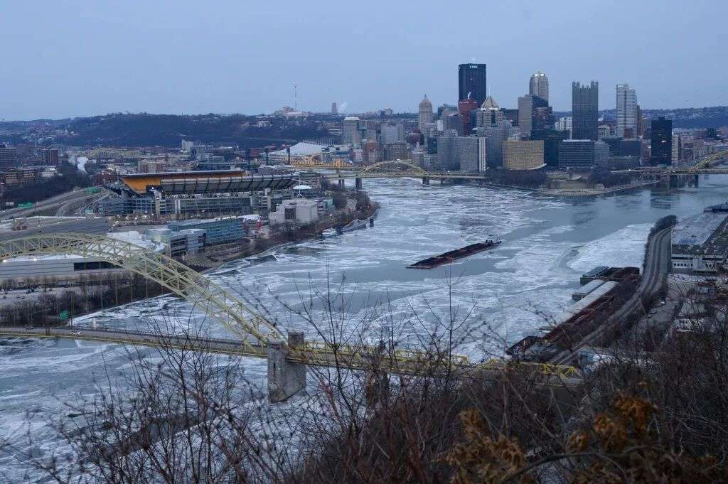 1月24日,美国宾夕法尼亚州匹兹堡,一艘船在冰冻的河面上运载煤炭。