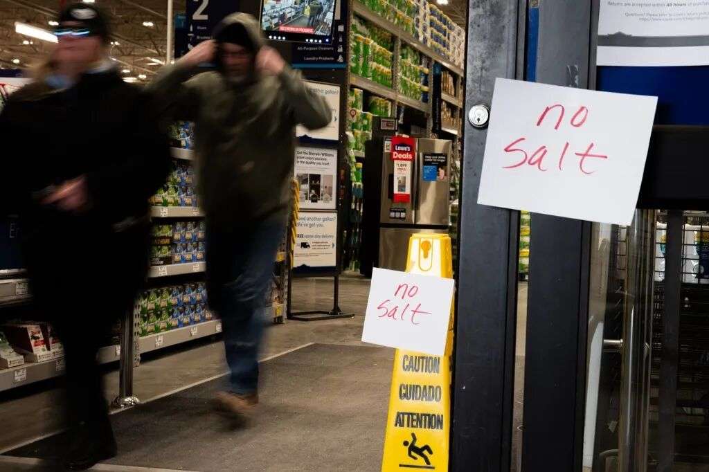 1月24日,美国宾夕法尼亚州费城,一家五金店挂出“无盐”标牌。