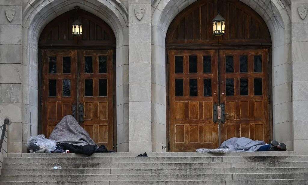1月24日,美国北卡罗来纳州夏洛特,无家可归者裹着毯子睡在一栋建筑前。