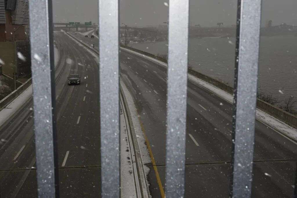 1月24日,美国肯塔基州路易斯维尔,车辆在风雪中的州际公路上行驶。