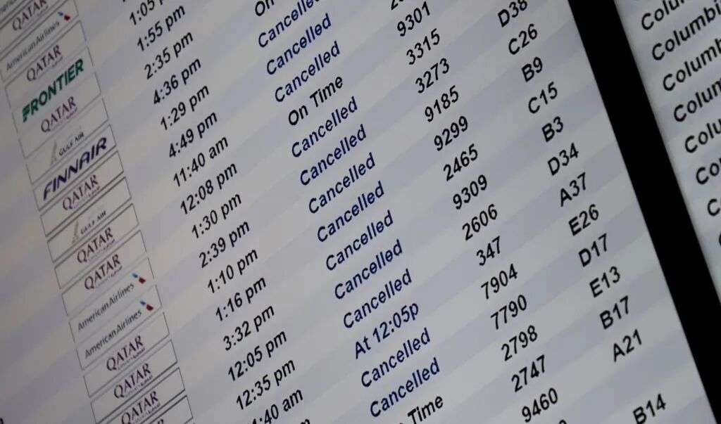 1月24日,美国得克萨斯州达拉斯,达拉斯-沃思堡国际机场的航班信息显示屏显示已取消的航班。