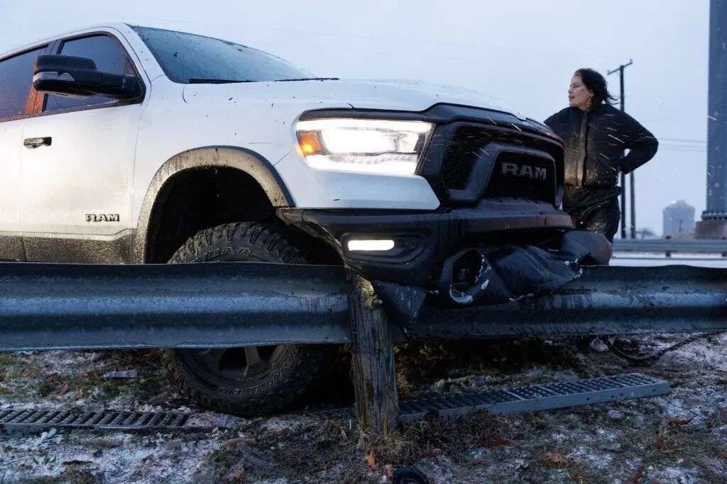 1月24日,美国得克萨斯州达拉斯,一辆卡车滑出公路撞上路障。