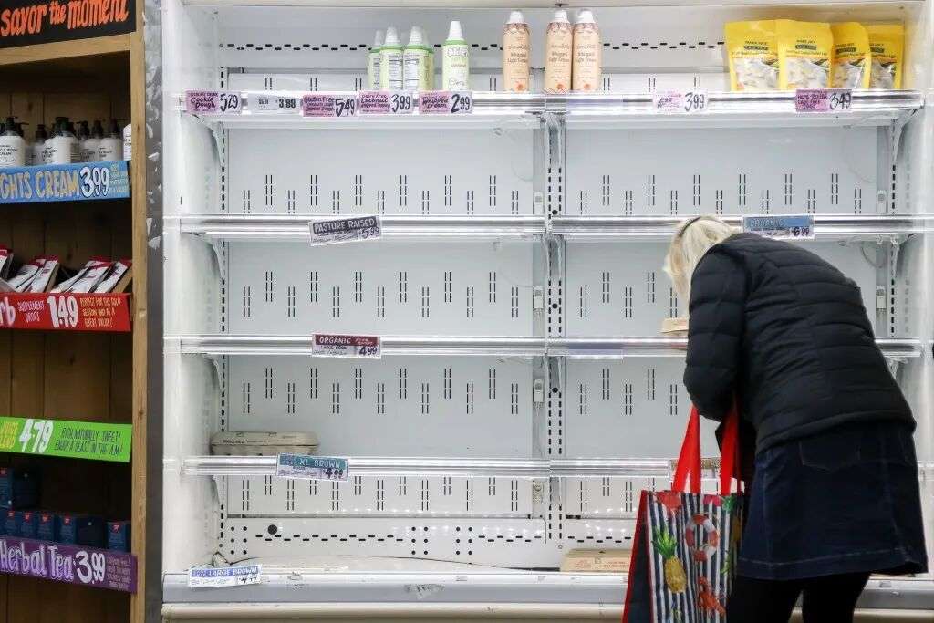 1月24日,美国纽约,一名顾客在一家商店的空货架前购物。