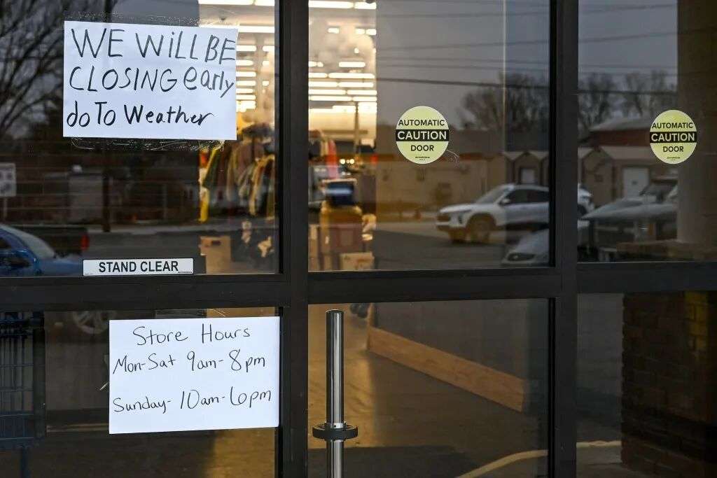 1月24日,美国肯塔基州辛西亚纳,一家商店张贴通知,告知顾客因天气原因提前关门。