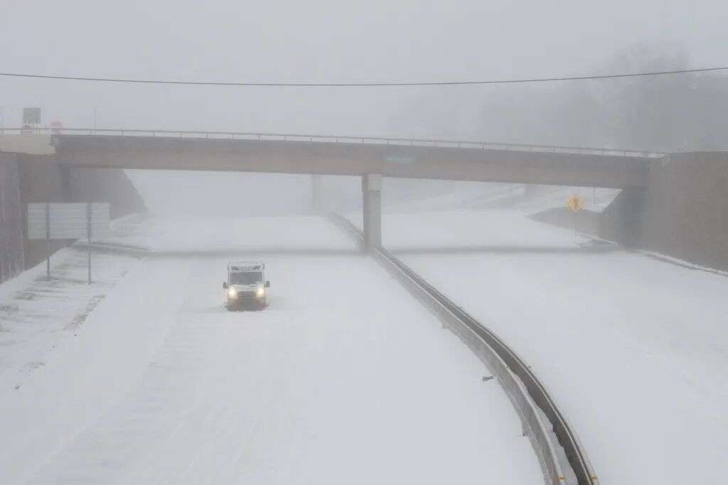 1月24日,美国得克萨斯州,一辆卡车在暴风雪中清理20号州际公路东行车道上的积雪。