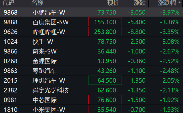 科网股多数下跌,小鹏汽车跌近4%,百度集团、哔哩哔哩、快手跌超3%,蔚来、零跑汽车跌超2%;腾讯音乐涨超3%。