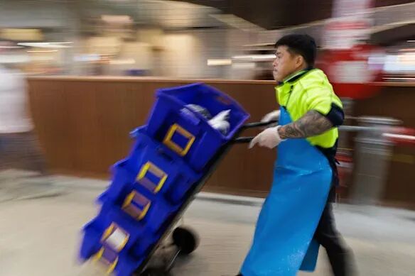 周日,一名工人在鱼市场的主零售层搬运海鲜。Max Mason-Hubers