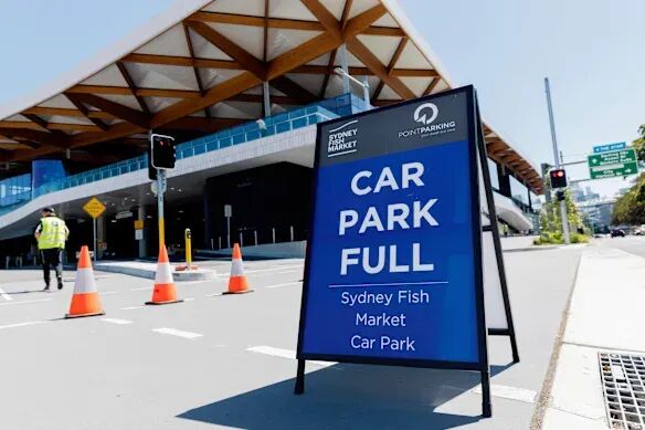 周日上午晚些时候,鱼市场地下停车场入口处显示车位已满。Max Mason-Hubers